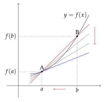 평균변화율은 $ ( a, \ f(a) ) $, $ ( b, \ f(b) ) $를 잇는 직선의 기울기와 같다.