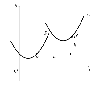 좌표평면에서 방정식 $ f(x, \ y)=0 $이 나타내는 도형을 $ F $, 도형 $ F $를 $ x $축의 방향으로 $ a $만큼, $ y $축의 방향으로 $ b $만큼 평행이동한 도형을 $ F' $이라 하자.